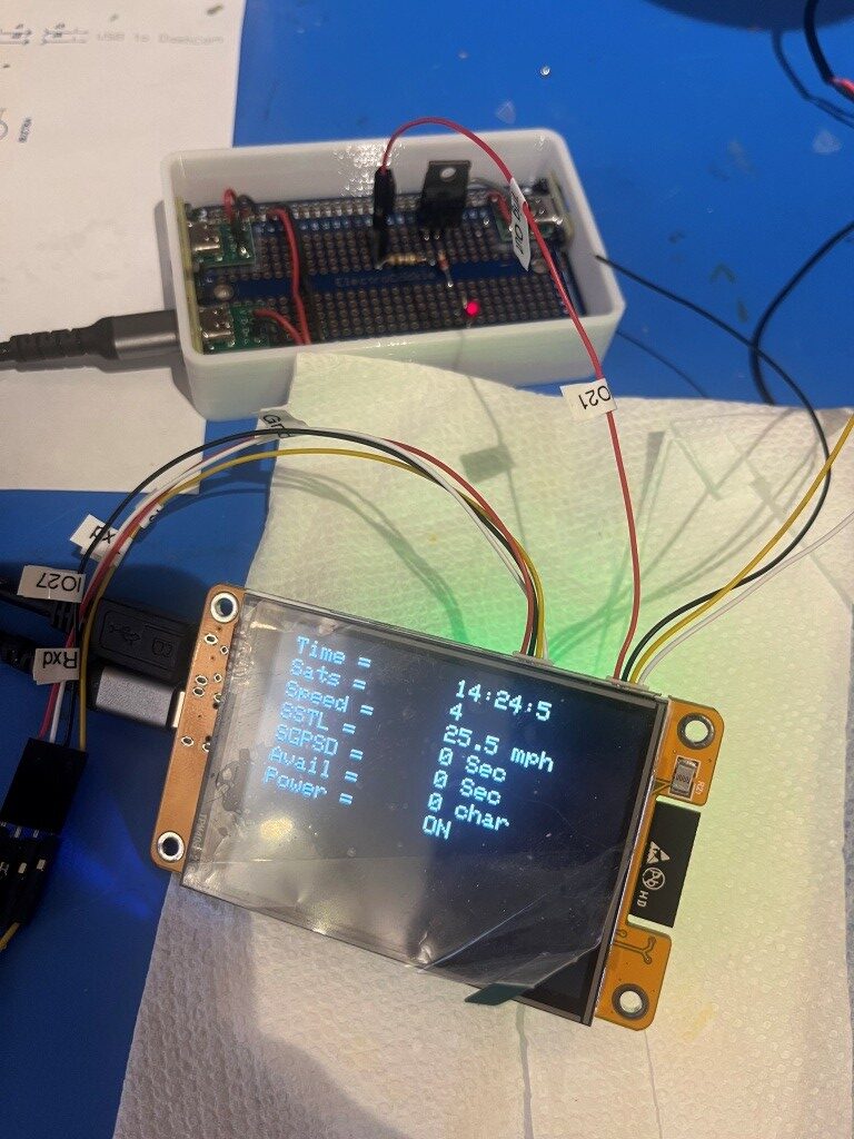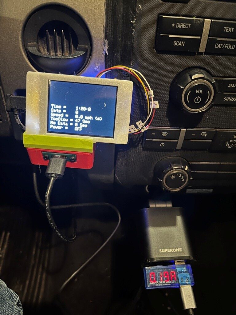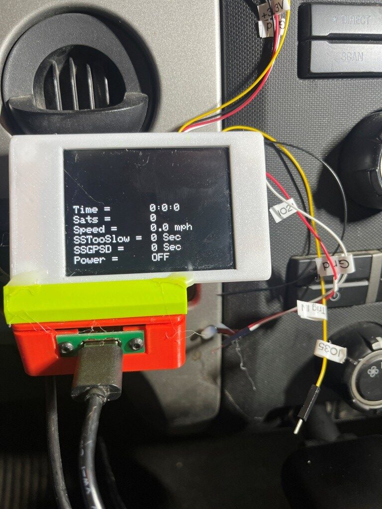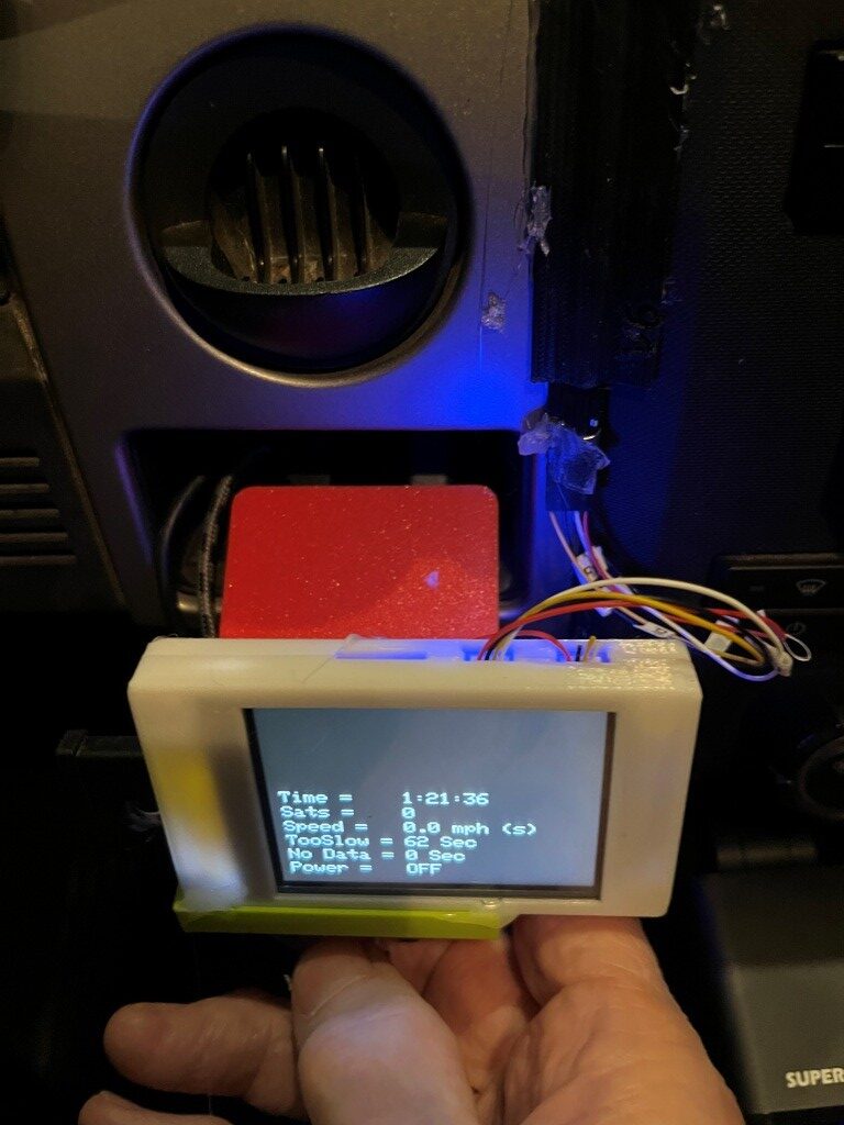 Here is a short video of the CYD display and power switch during a driving test in my local development loop. At the start of the video, the GPS module has already detected 8 sats (hard to see), so as soon as the computed speed goes over 5mph, the power switch changes from OFF to ON (red LED on the power switch and ‘ON’ on the CYD.