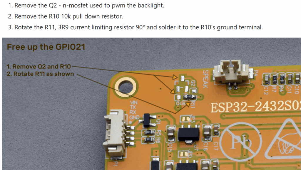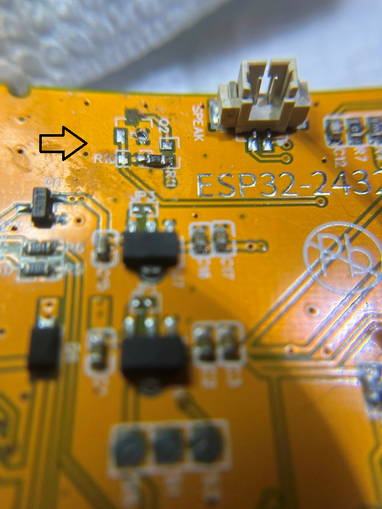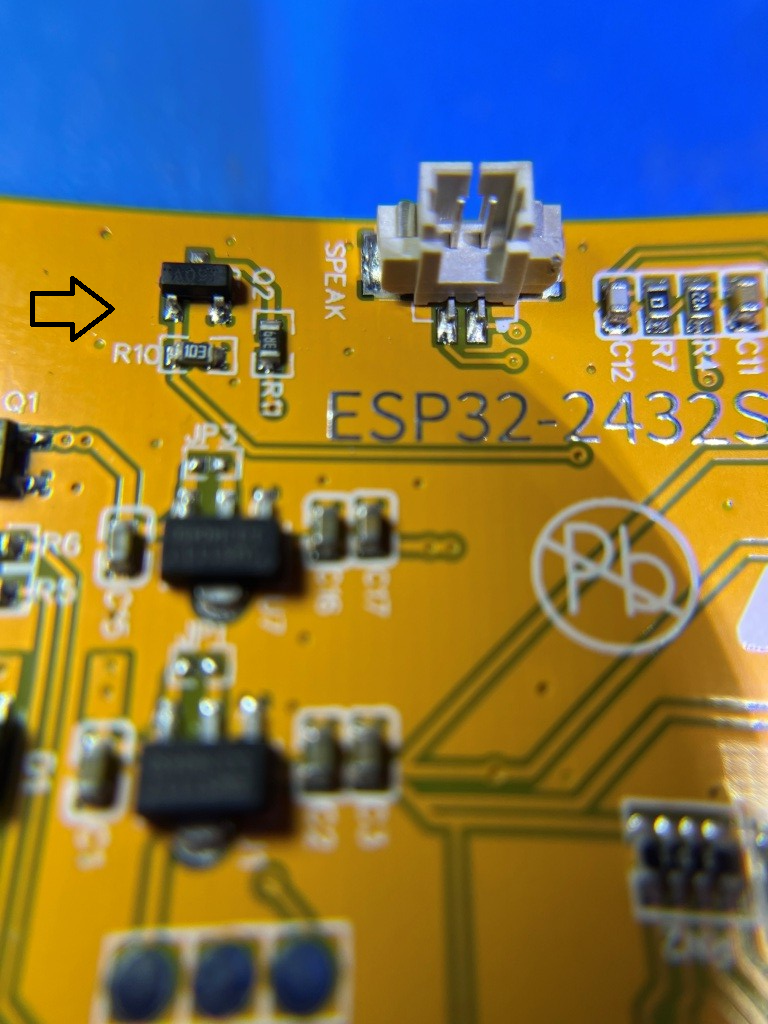 I was able to easily connect the GPS input to CN1 and use the NMEA simulator to test the code, ported over from the Pro Micro project. However, I hit a roadblock when I went looking for a GPIO port to use as a switch signal to the power switch board; it turns out the display occupies most of the GPIO lines, and the two ports needed for GPS Txd & Rxd took the only remaining output-capable lines (IO35 is available, but it is input-only). Some more research with the help of Grok led me to this project site that describes how to free up ports via hardware mods. There I found directions for freeing up IO21, the port that normally controls display backlight brightness by PWM-ing the backlight LED. This involved removing a surface-mount transistor and re-orienting a TINY! surface-mount 3.9 Ω current-limiting resistor, as shown in the screenshot below:
