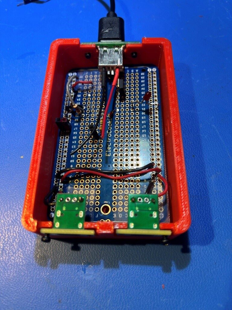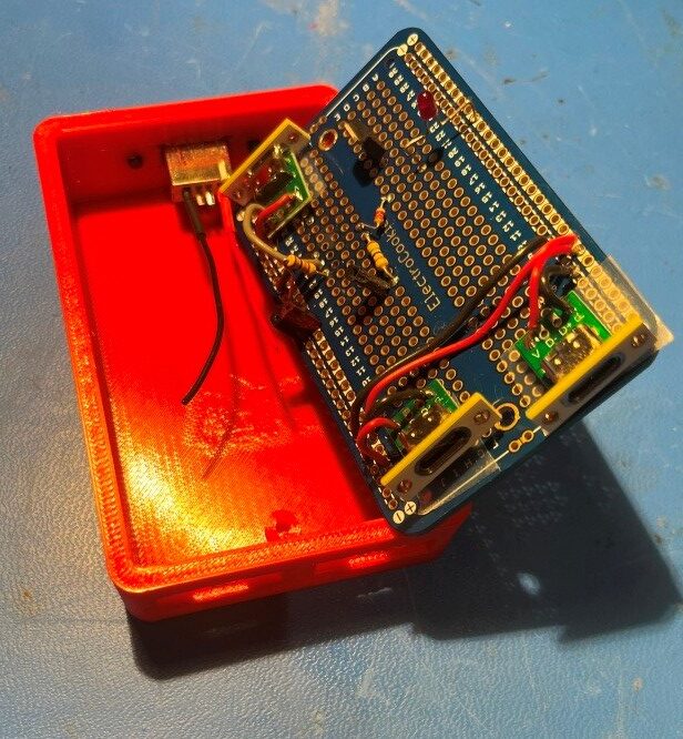 When I started wiring everything in, I realized I had created a big problem. If I ever wanted to remove the proto-board from the enclosure, I would have to unsolder all the wires to the USB connectors first – UGH!! I thought I could solve this problem by adding connectors in the lines to the USB connectors, but I hated that idea as it just adds complexity (“a connector is a source of trouble between two other sources of trouble”), so I put the whole thing aside to await a better solution. This morning while exercising it came to me – redesign the enclosure so the parting line between box and lid is right at the top edge of the connector modules. Then the proto-board and connectors can be lifted right out after removing the two proto-board mounting screws – genius! Only one small ‘gotcha’ the USB-C connectors will have to be flipped 180𝆩 so the PCB slot is on top rather than on the bottom. Since USB-C connectors are orientation insensitive anyway, this shouldn’t be an issue. Here’s a screenshot of the ‘final’ (as final as anything gets in my world) enclosure, with the connector cutouts moved to the top so removing the lid will allow the PCB – with the connectors still attached – to be lifted out.