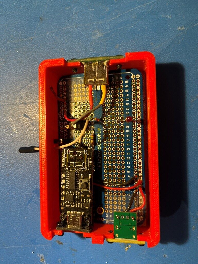 I printed up a small right-angle adaptor to mate the holes on the USB-C module with the holes on the box, but I had to mount the module on the inside wall – I decided not to make a new box just for this issue. So now The PD-enabled retractable cable on the cigar-lighter adaptor delivers 5V to the module and life is good!