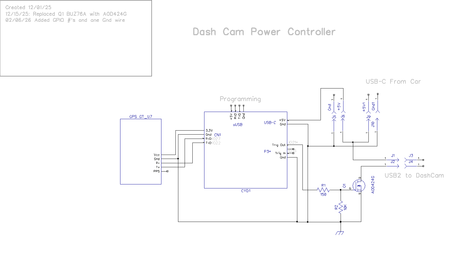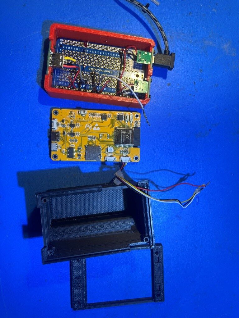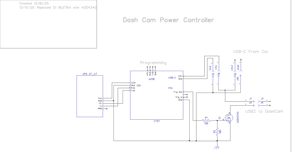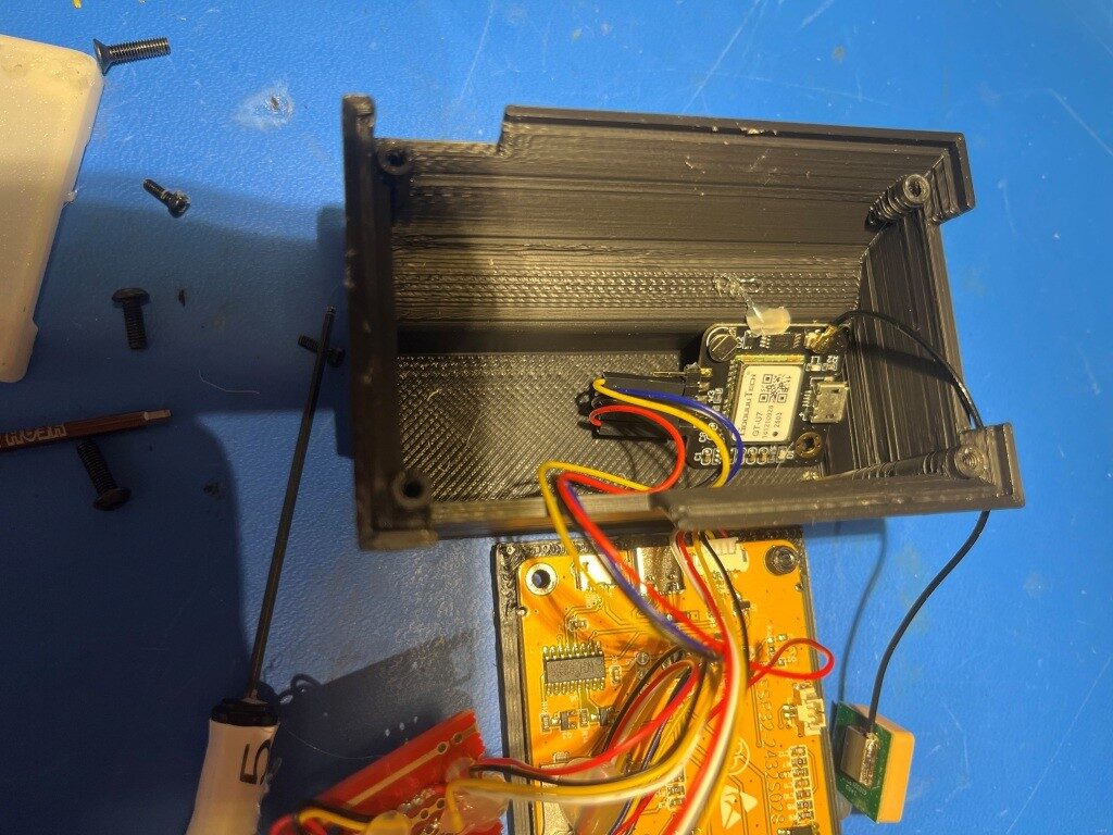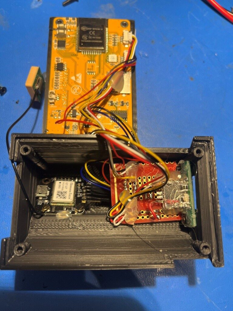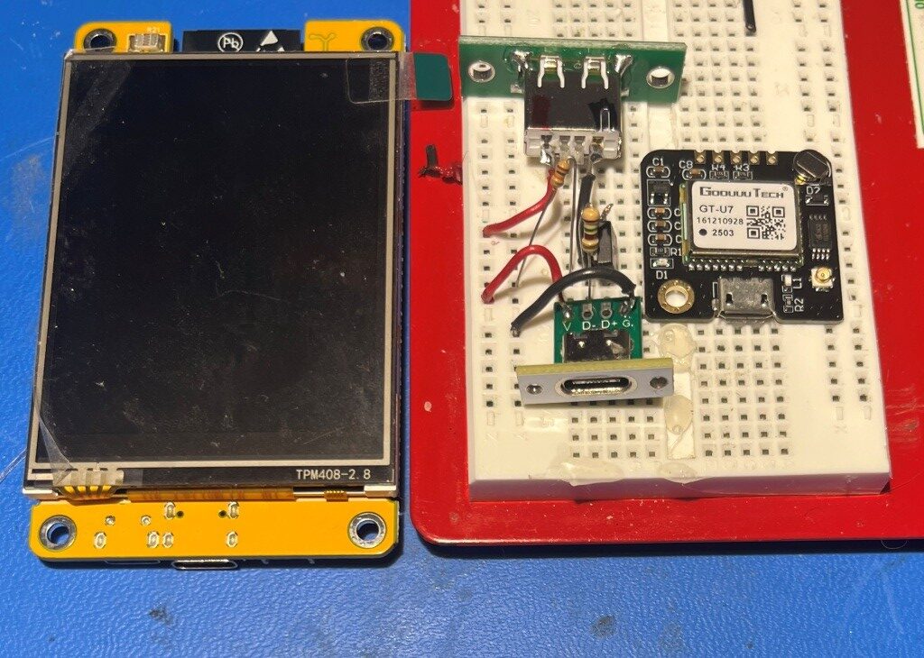 As shown above, the power input (USB-C), power output (USB2), switch (AOD424 MOSFET) and GT-U7 GPS modules easily fit into the footprint of the CYD display. I should be able to put everything into one box with the footprint of the CYD and sufficient depth to accommodate the switch & GPS hardware