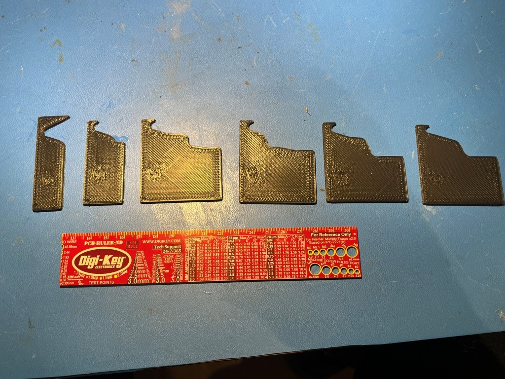 Then I used my 3D printer magic to print out successive profile estimates until I got reasonably close to the actual profile. This then can be used for the actual box design. The following photo shows the progression from left to right.