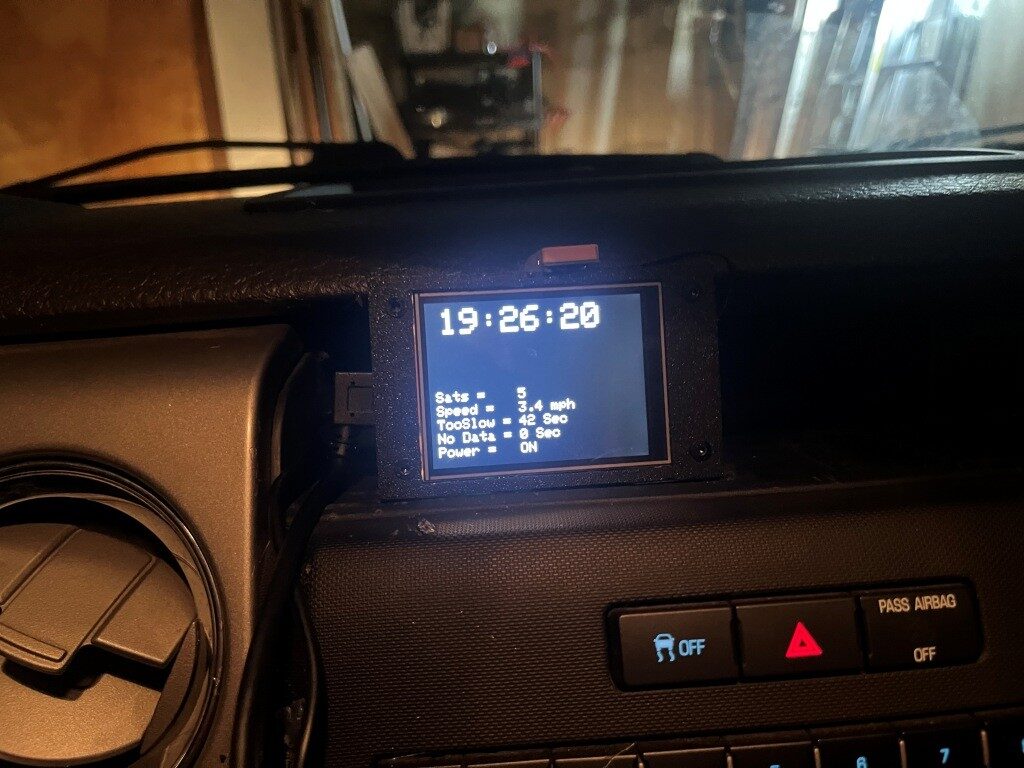 I also noticed that when I drive into my earth-sheltered garage, I get some strange status display readings. The number of sats will go to zero, but the clock time will often stay running (and stay accurate). Also, since the clock is active, the speed value will actually start to climb (divide by-almost-zero?) and so the speed criteria for keeping the power ON will be met. I think the way to handle this is to have a separate block in the logic for sats < min_satellites to force everything but the ‘Too Slow’ and ‘No Data’ timers to show “n/a”