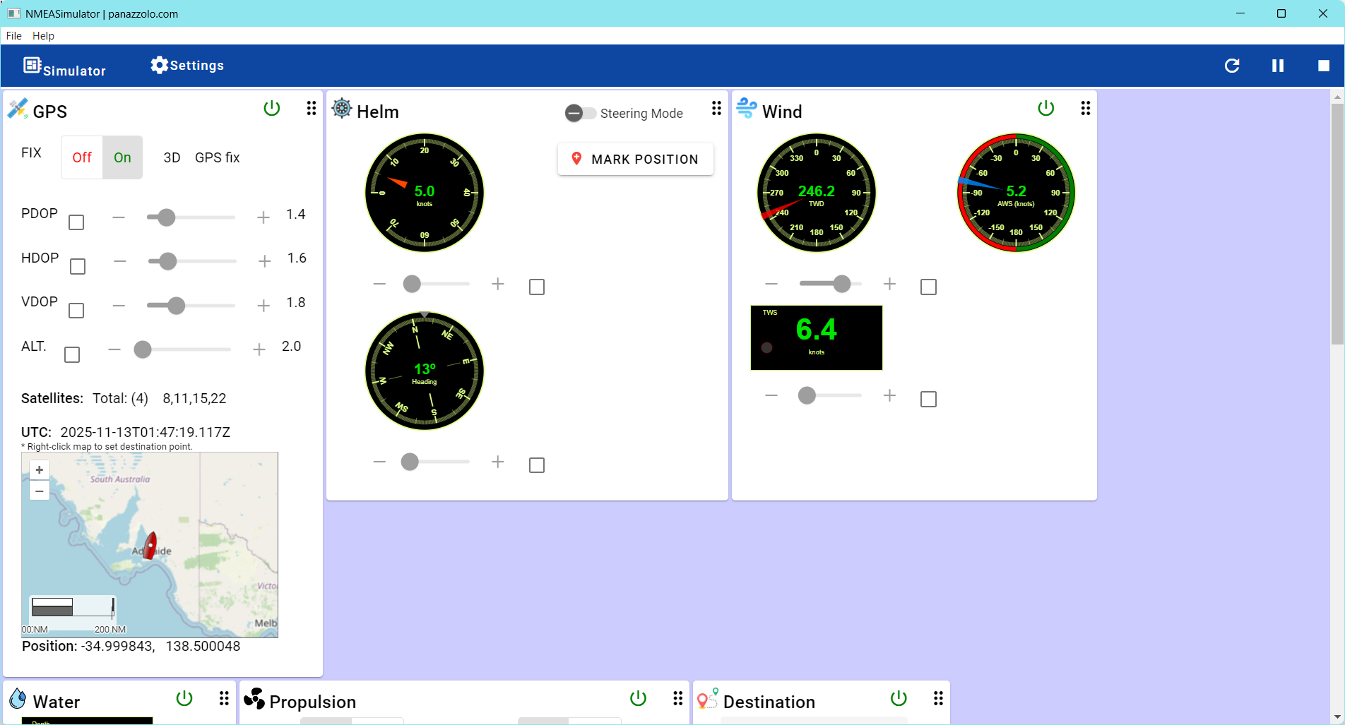 Now to test the code. I found a free web-based app called NMEASimulator by panazzolo.com that allows me to set a course with heading and speed, and then output the corresponding NMEA sentences to a COM port. With a USB-to-Serial adapter I should be able to replace the data lines from the GPS module with the simulator output and test the code.