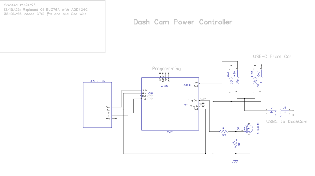 Thinking about how to test my GPS-enabled power switch project, I decided to add a cheap LCD display so I could monitor GPS output and power switch status in real time. So, I reached into my parts box and what came out was a pair of ‘Cheap Yellow Display’ modules had been laying around for some time now. As I started working with the display, I realized it wasn’t just a display; the ESP32-2432S028R development board that runs the touch-sensitive display incorporates a ESP32-WROOM-32 module as its main microcontroller. This module features a dual-core Xtensa LX6 processor running at up to 240 MHz, 520 KB SRAM, 448 KB ROM, integrated Wi-Fi (802.11 b/g/n) and Bluetooth (v4.2 BR/EDR and BLE), and 4 MB flash memory. In addition, the board has a standard micro-USB port for power and programming, a USB-C port for power, three 4-pin micro-JST 1.25mm pitch connectors for UART and GPIO, and a 2-pin micro-JST connector for a speaker. Looking at the specs, I realized I could conceivably eliminate the Sparkfun Pro Micro module entirely, and have just the display/CYD connected to the GPS via CN1 (4-pin GPIO/power/GND) and a single GPIO output (plus GND) to run the power switch.